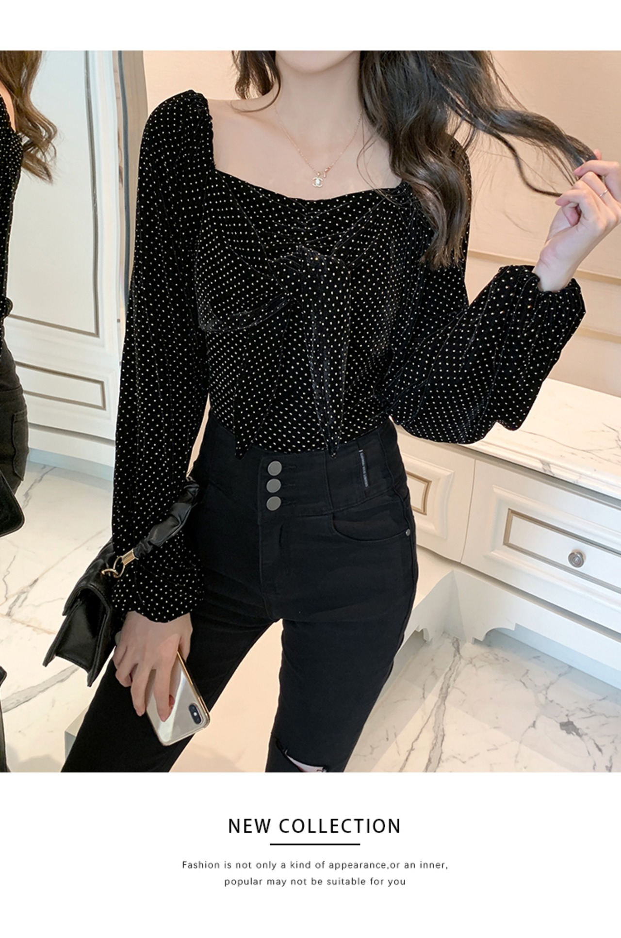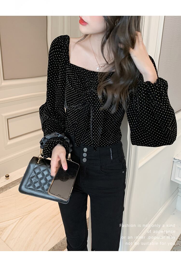 フレンチレトロスクエアネックショートベルベットトップレディースデザインセンスニッチウエストスリムランタンスリーブボトミングシャツ秋冬 オータム 秋物 ウィンター 冬物 スクウェア yingd85279258691