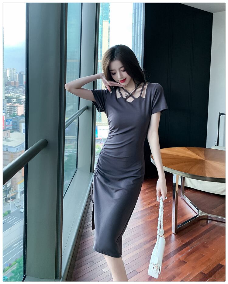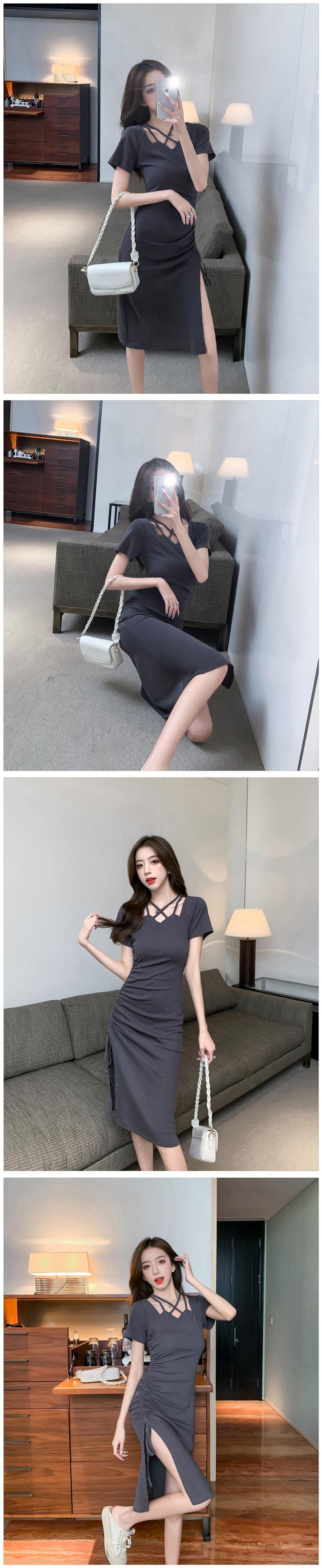 フランスのレトロシックなデザインのスカートスリムフィットと細い巾着プリーツセクシーなスリットバッグヒップドレス女性の夏 サマー 夏物 yingd22844110534