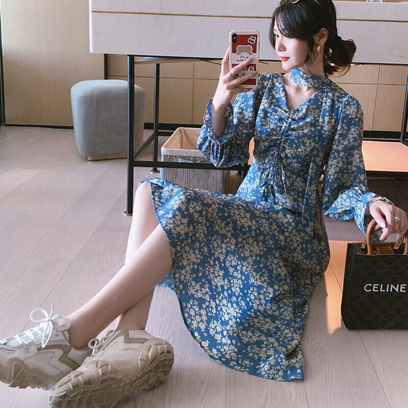 2020年秋新気質女神ファンゆうじえやさしい風が塩辛くて甘い長袖フローラルシフォンドレス ロング 大人ガーリー スウィート キュート カジュアル オータム 秋物 花柄 yingd42894859310