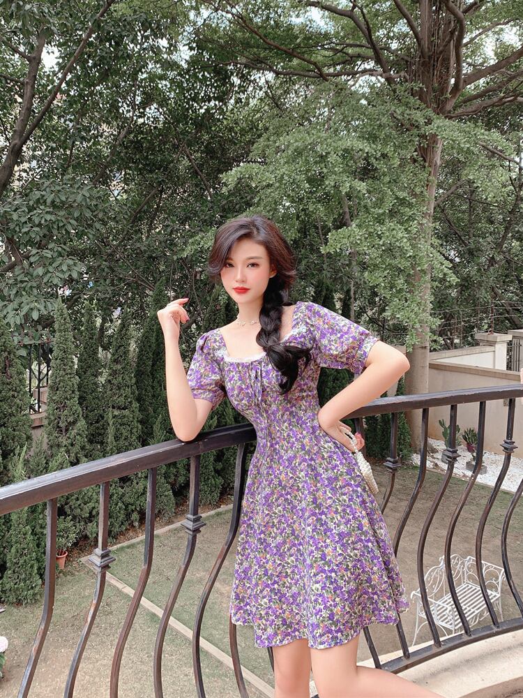 サマードレス2020新しい女性のフレンチレトロスクエアカラーヘップバーンスタイルフローラルスカート気性ウエスト薄手のドレス女性 夏物 花柄 スクウェア yingd82663160248