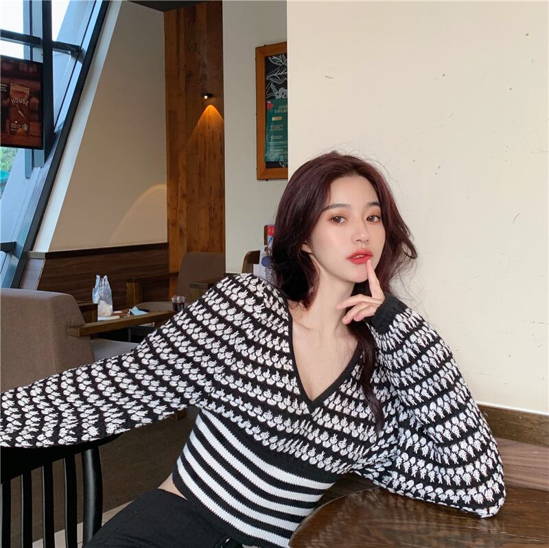 ニット秋新作レディースウエストと細身気質Vネック丁寧なマシントップデザインショートニットセーター オータム 秋物 yingd67635067470