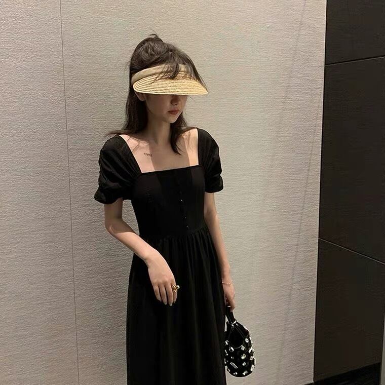 夏の薄いロングスカート女性のウエスト細い気質の女神ファンフレンチレトロヘップバーンスタイルのスクエアカラードレス女性の夏 サマー 夏物 スクウェア yingd22008766854