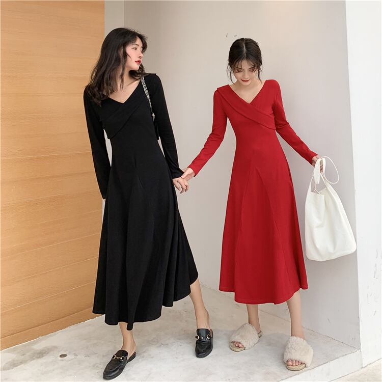 2020年秋新作レディースフレンチレトロデザインスカートライトおなじみスタイルミドル丈膝上ニットワンピース オータム 秋物 yingd78881590151