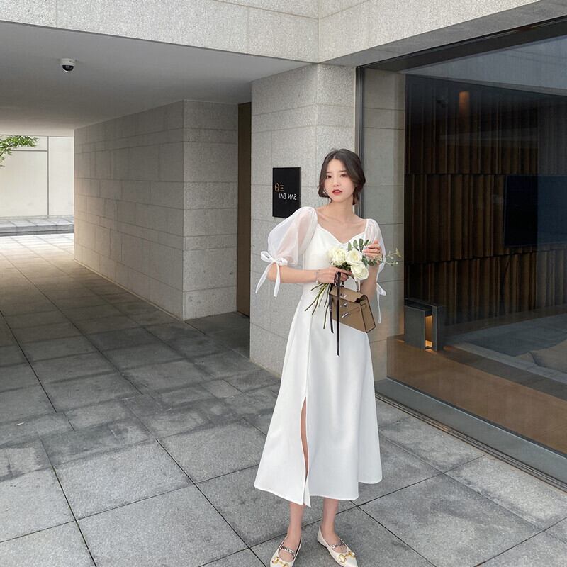 フランスのレトロな人気のヘップバーンスタイルのリトルブラックドレス2020新しい気質の女神ファンスクエアカラースリットドレス女性の夏 サマー 夏物 スクウェア yingd59044777408