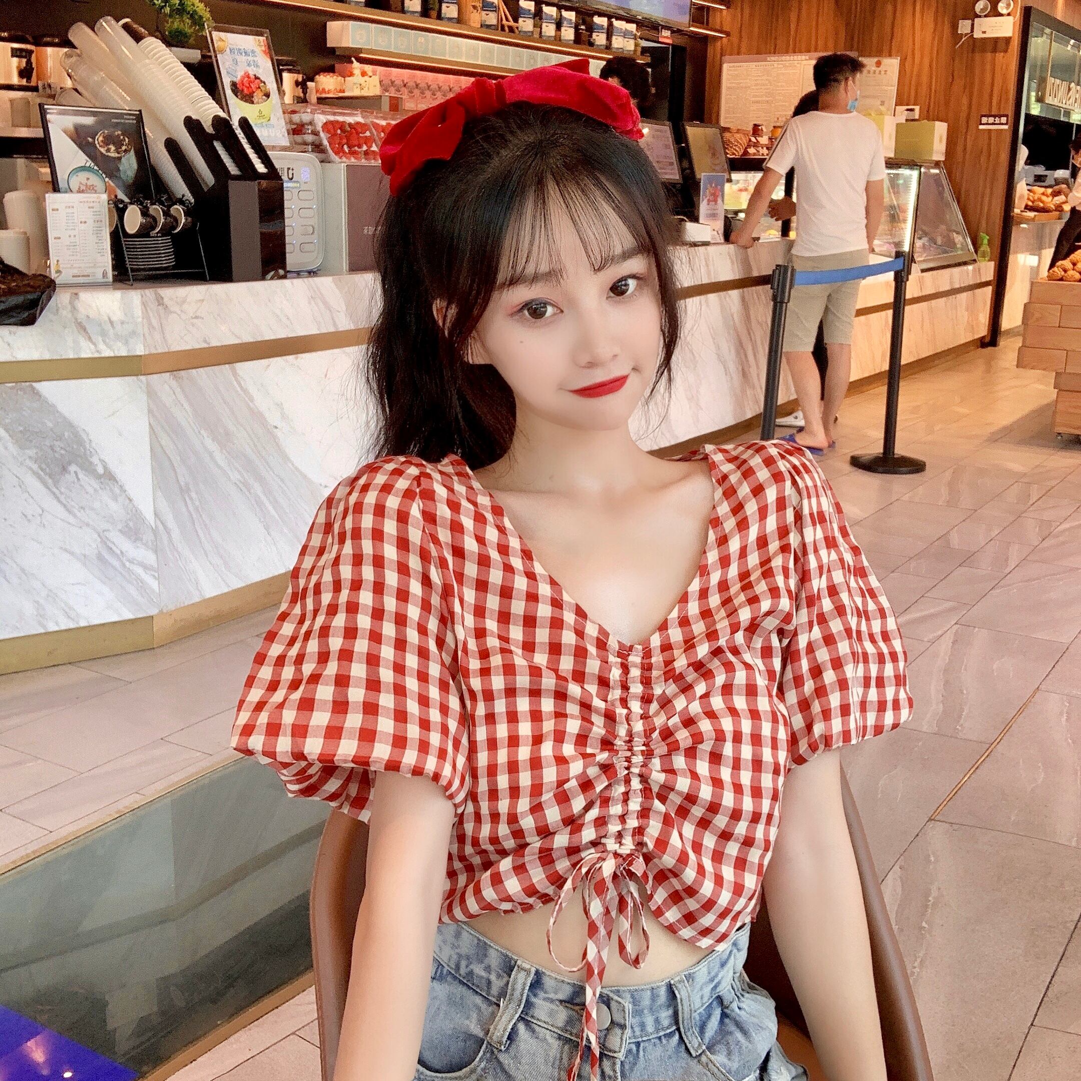 2020年夏の新バージョンルーズチェック柄ドローストリングショートクロップドネーブルトップレディーススケミングデザインニッチシャツ サマー 夏物 yingd74073744067