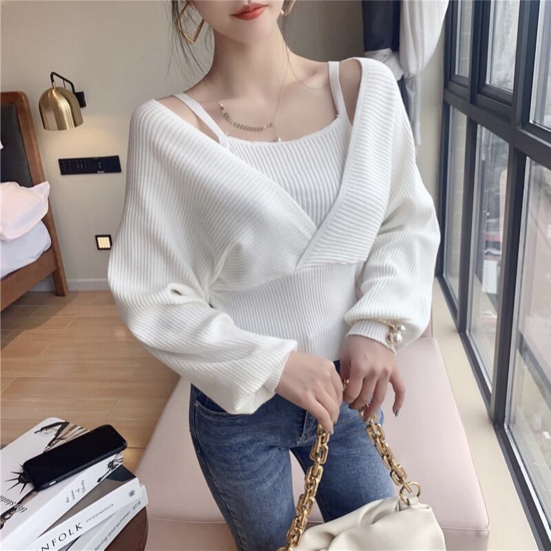 2021年春の新しい気質、セクシーで注意深いマシン、ワンショルダーのクロスネック、オフショルダーの長袖ニットセータートップの女性 ロング スプリング 春物 yingd6330323939