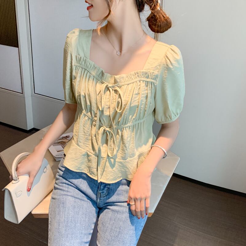 スクエアネックパフスリーブトップウィメンズ2020ニューフレンチレトロ半袖シャツウィメンズデザインセンスニッチシフォンシャツ スクウェア yingd42135132650