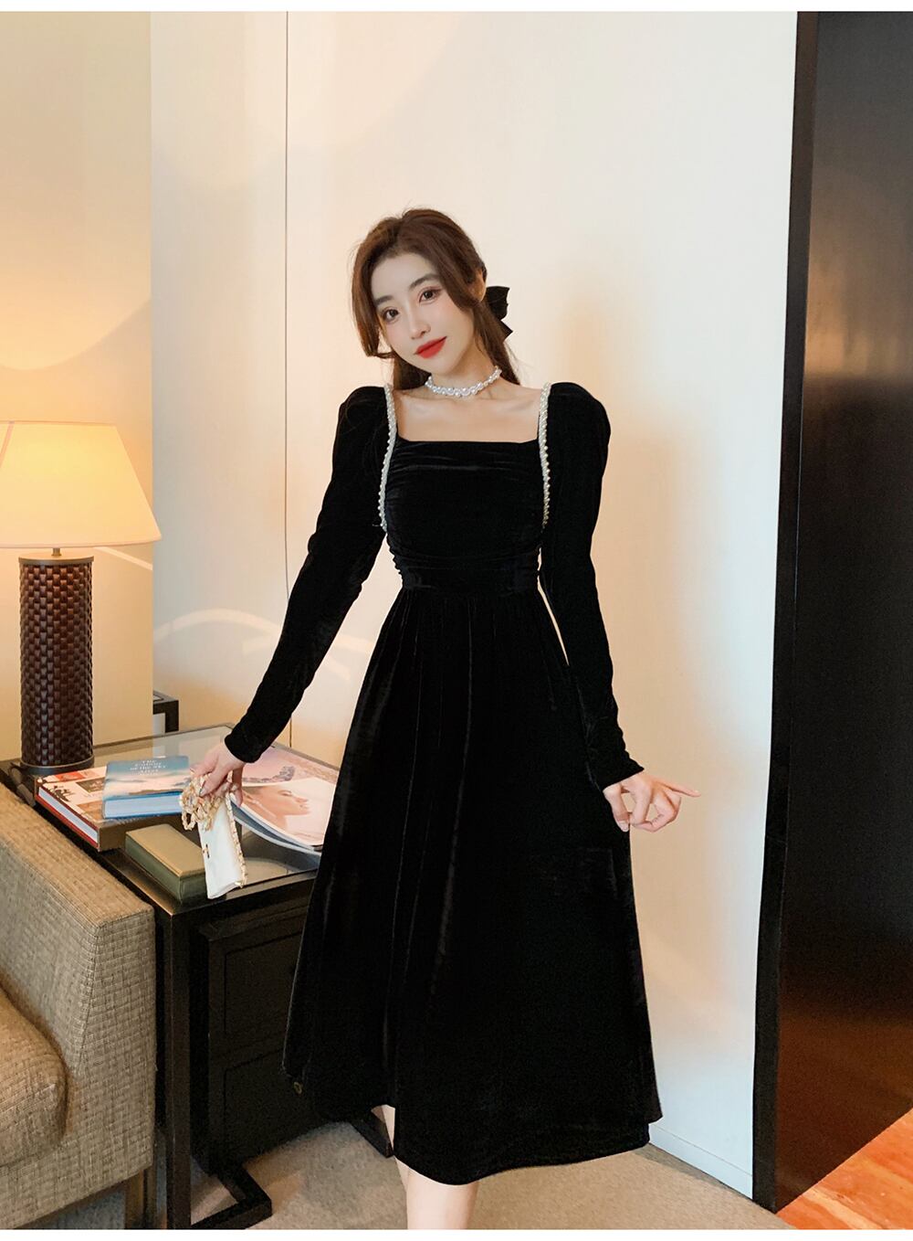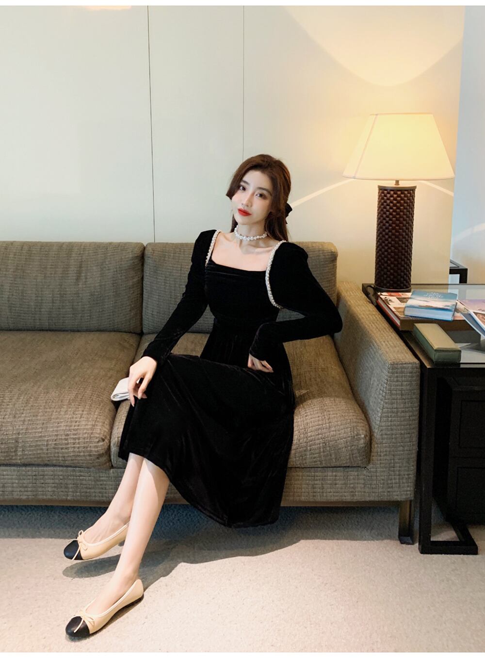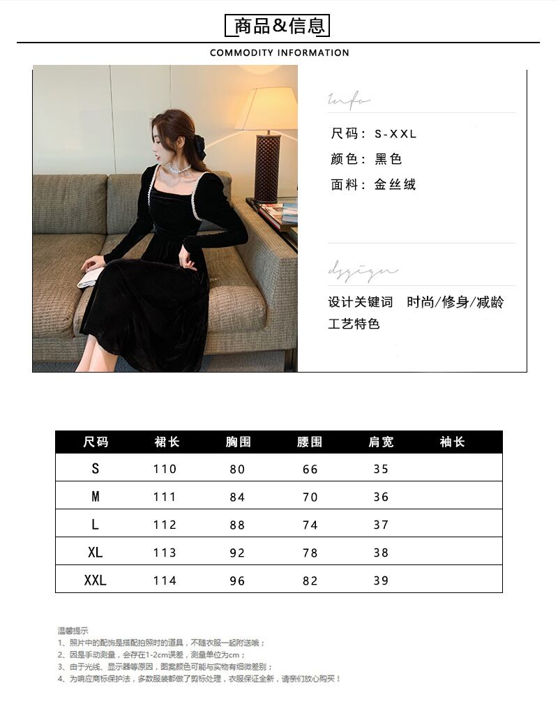 スカート女性の秋と冬フレンチレトロスクエアカラーヘップバーンスタイルリトルブラックドレス気質ライトラグジュアリーレディースゴールドベルベットドレス女性 オータム 秋物 ウィンター 冬物 スクウェア yingd90254232142