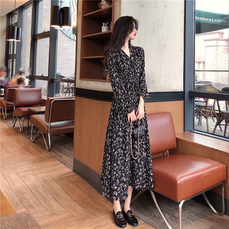 フランスのレトロなロングスカート足首フェアリーエアベルフラワースカートウエストと細い気質Vネック花柄ドレス女性秋 オータム 秋物 フラワーデザイン yingd23896794474