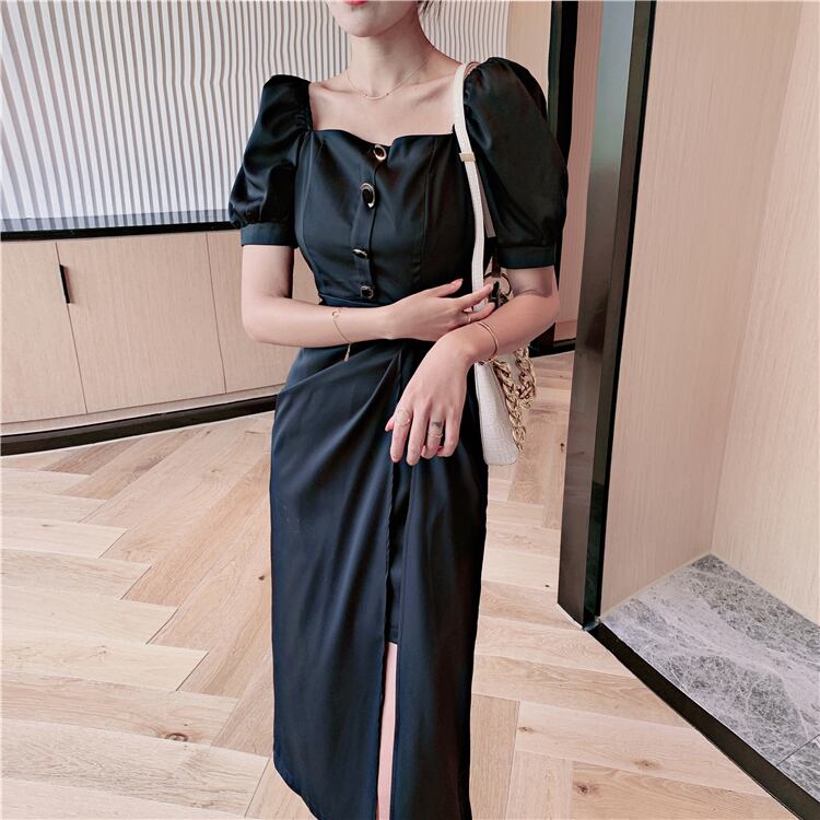 フランスのレトロなヘップバーンスタイルのウエストと薄い気質の女神ファンパフスリーブ黒のドレス女性の夏のリトルブラックドレス サマー 夏物 yingd27496064533