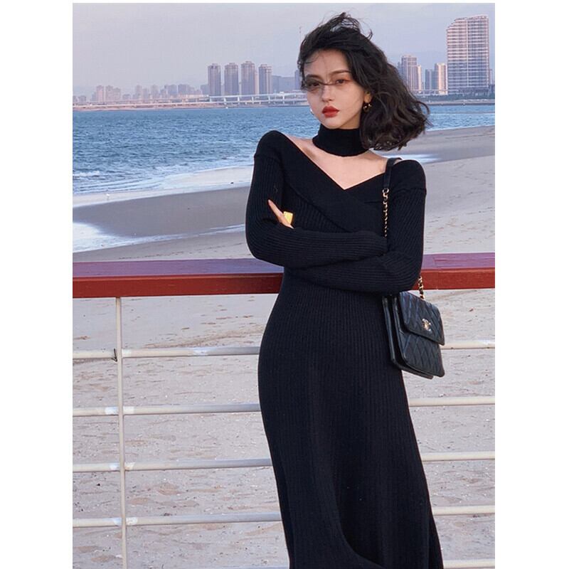 スカート冬コート付き冬スカート膝上セクシーなVネックスカーフニットドレス女性の長いセータースカート ロング ウィンター 冬物 yingd2751673051