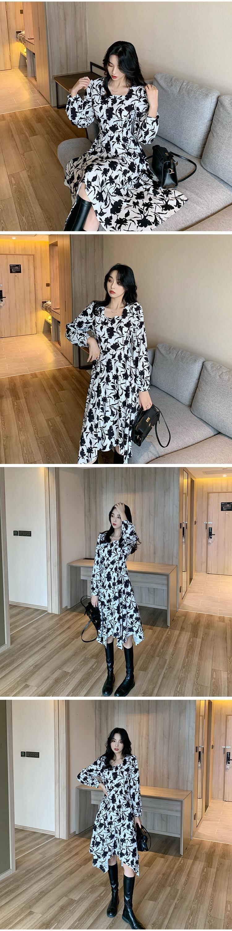黒の長袖ドレス女性の2020年春秋新作フレンチスタイルレトロウエストウエストスリム気質スクエアカラーミドル丈スカート ロング ブラック スプリング 春物 オータム 秋物 スクウェア yingd35544570057
