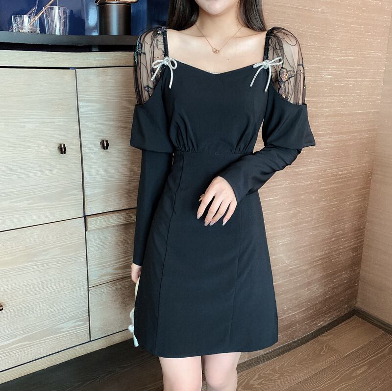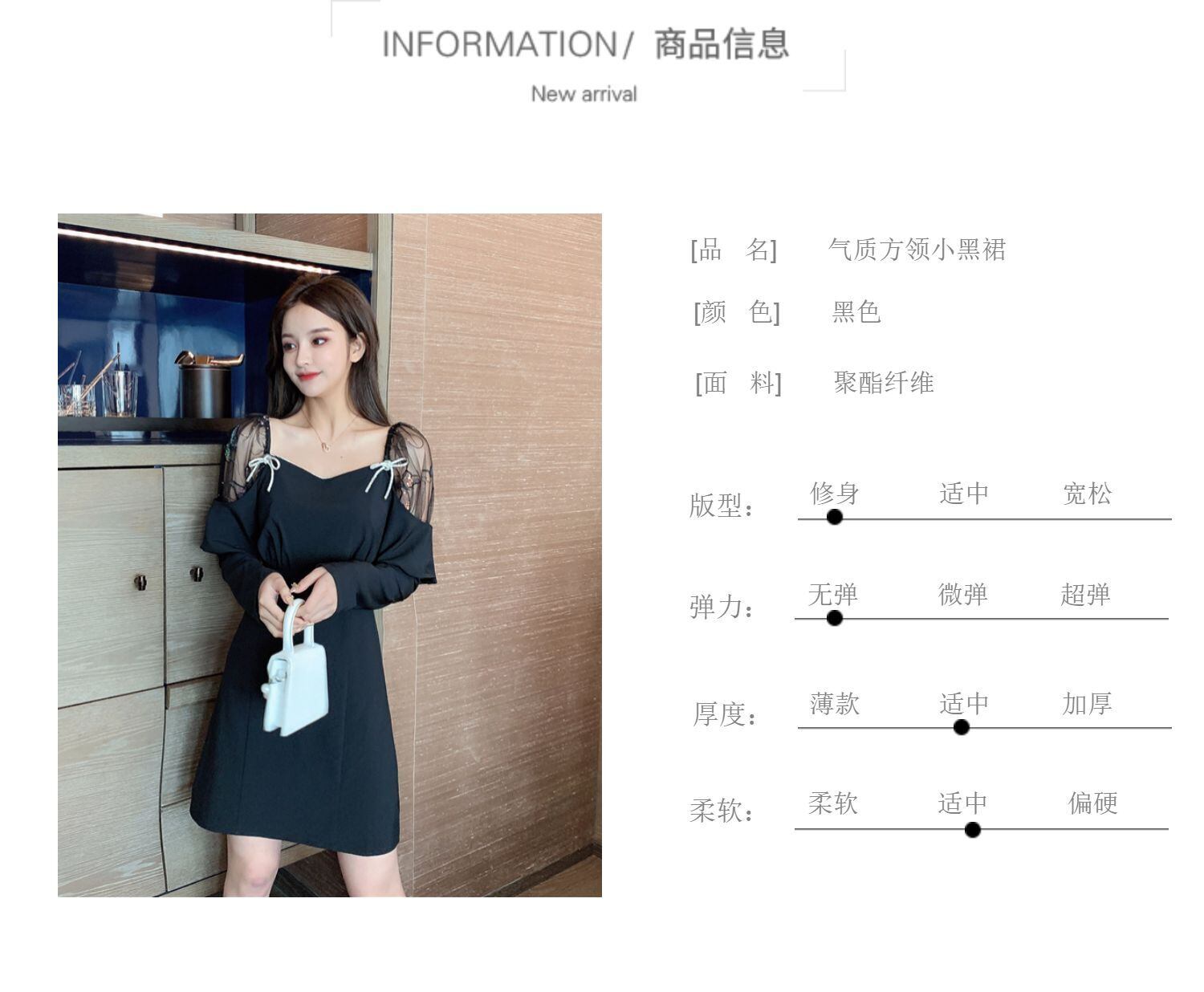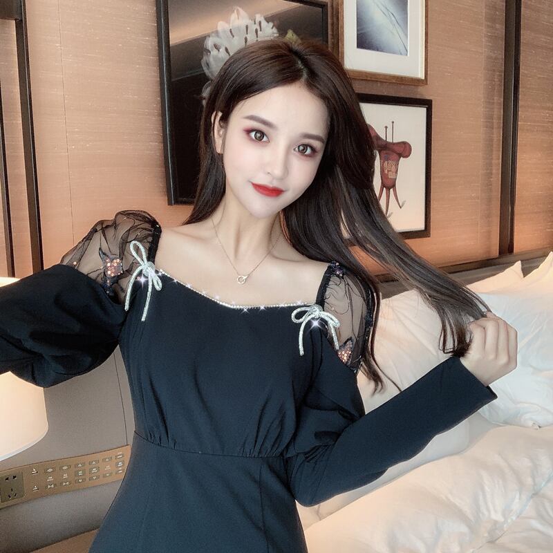 2020年秋の新しい女性のフレンチレトロメッシュステッチ気質年齢を減らし、薄いスクエアネックの長袖ドレスの女性 ロング オータム 秋物 スクウェア yingd30472856706