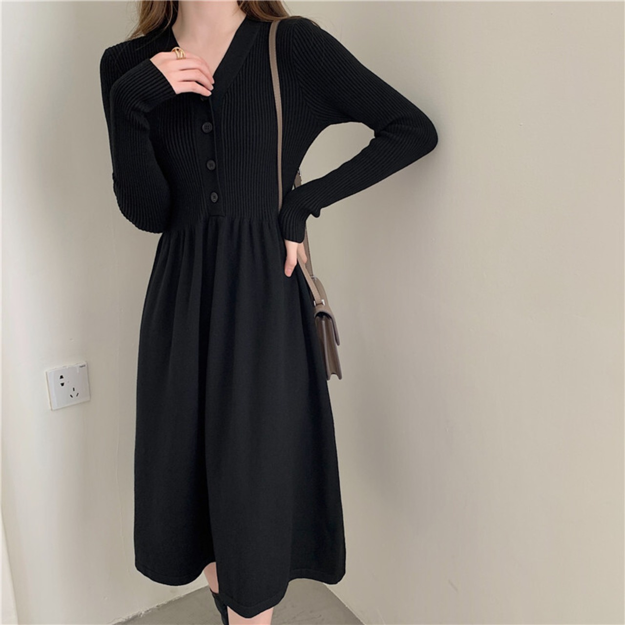 フランスのレトロなヘップバーンスタイルのウエストとスリムな気質のVネックのボトミング、秋と冬のスリムなニットドレスの女性 オータム 秋物 ウィンター 冬物 yingd75951154092