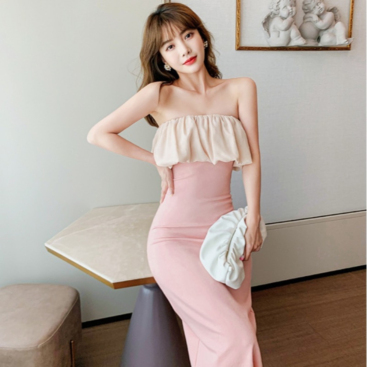 フランスのレトロな夏の薄いロングスカートのデザインセンスニッチライトおなじみのスタイルセクシーなワンショルダーチューブトップドレス女性の夏 サマー 夏物 yingd24311095285