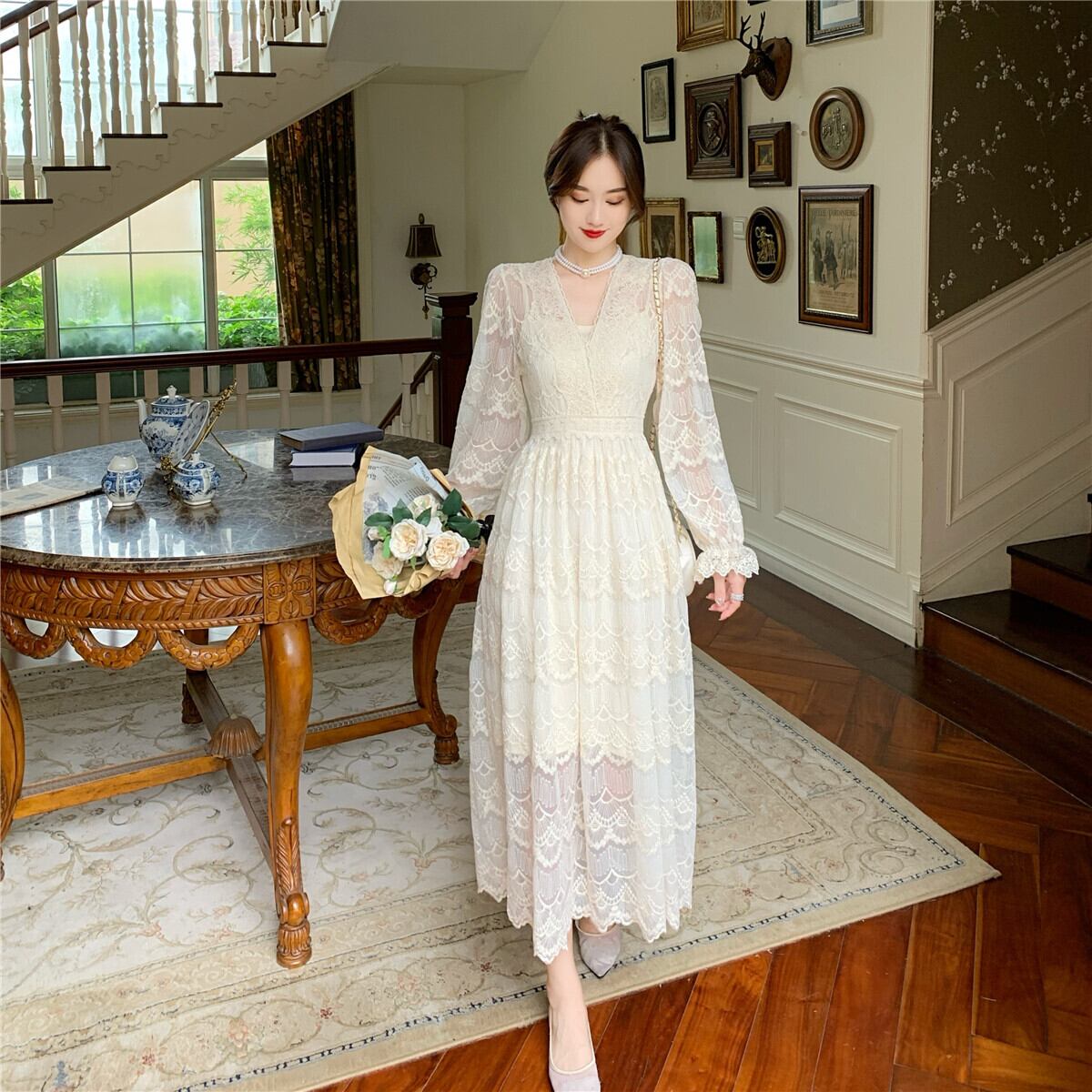 フレンチレトロライトラグジュアリーデザインスカートライトおなじみスタイルハイエンド気質レディース長袖レースドレスレディース秋冬 ロング オータム 秋物 ウィンター 冬物 yingd5659661335