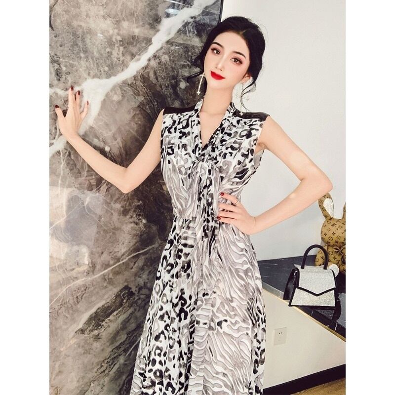 コールドウィンドレディースハイエンドノースリーブヒョウ柄ロングスカートライトラグジュアリーレディースフライドストリートシフォンドレスレディースサマー 夏物 yingd94973206072