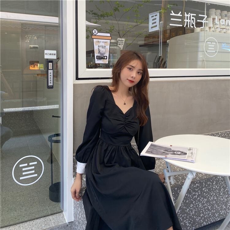 フランスのレトロなウエストスリミング気質注意深いマシンデザインスカートライトおなじみのスタイル黒長袖ドレス女性秋 ロング ブラック オータム 秋物 yingd29915960255