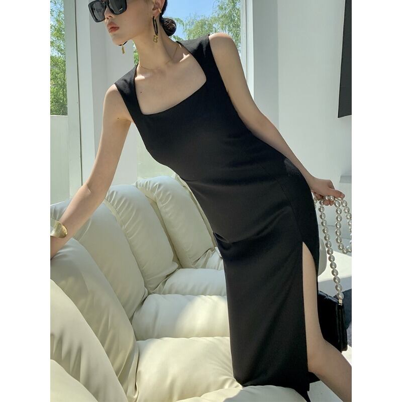 フランスのレトロなヘップバーンストラップドレス夏のウエストスリム気質セクシーなサイドスリットスクエアネックドレス女性の夏 サマー 夏物 スクウェア yingd2811513361