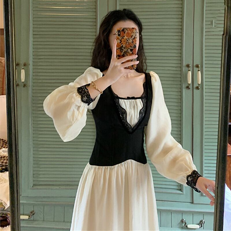 春物2021年新作フレンチレトロウエストウエストショー薄手の気質ライトラグジュアリーデザインセンスレースステッチドレス女性 スプリング yingd66306478644