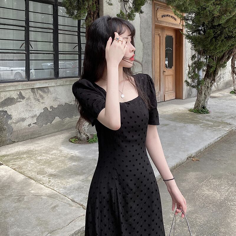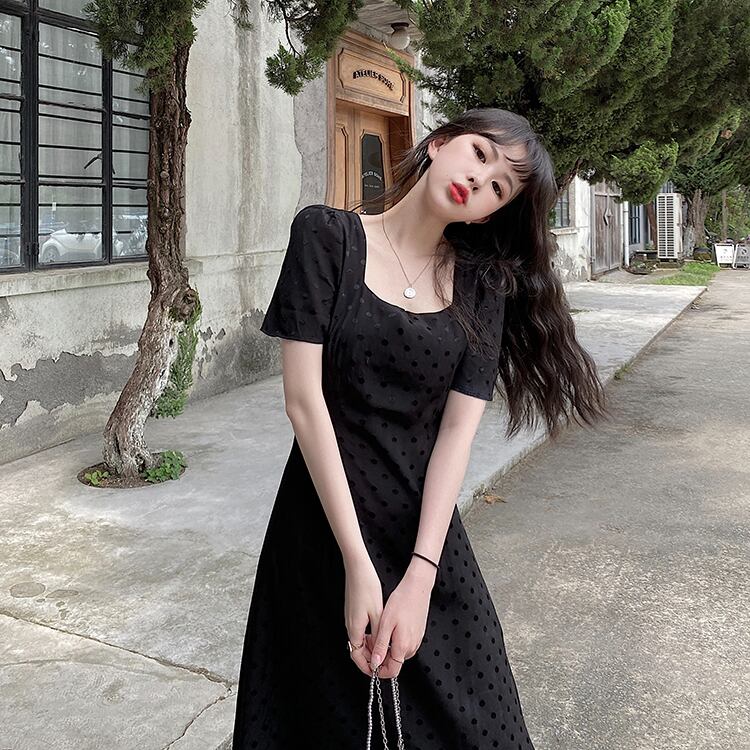 フレンチレトロ水玉スクエアネックブラックドレスレディースサマードレス2020新気性ウエストと薄手の膝上ロングスカート 夏物 スクウェア yingd28076377319