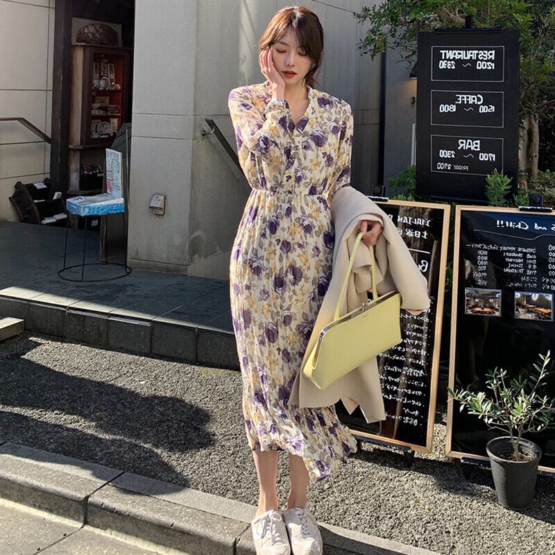 フランスのレトロな長袖シフォン花柄ドレス2021年春の女性の新しい優しいスタイルのVネック花柄ドレス ロング スプリング 春物 yingd2560854093
