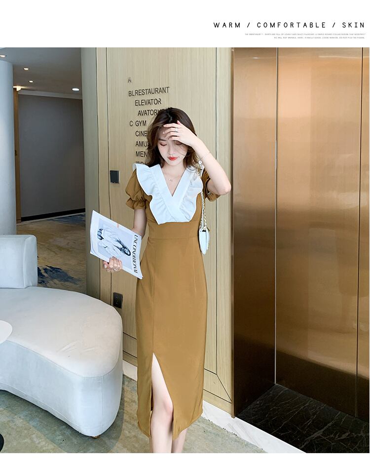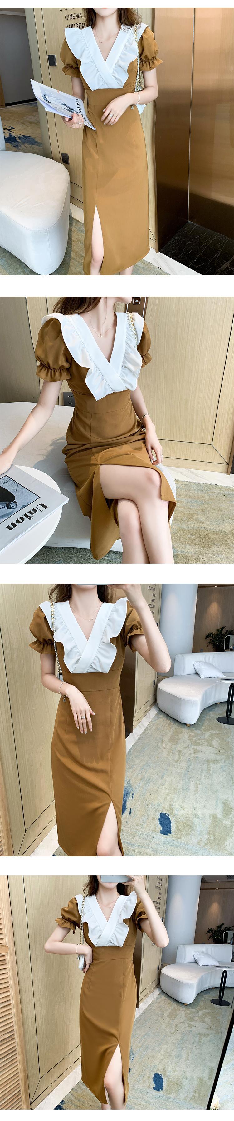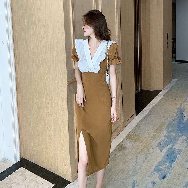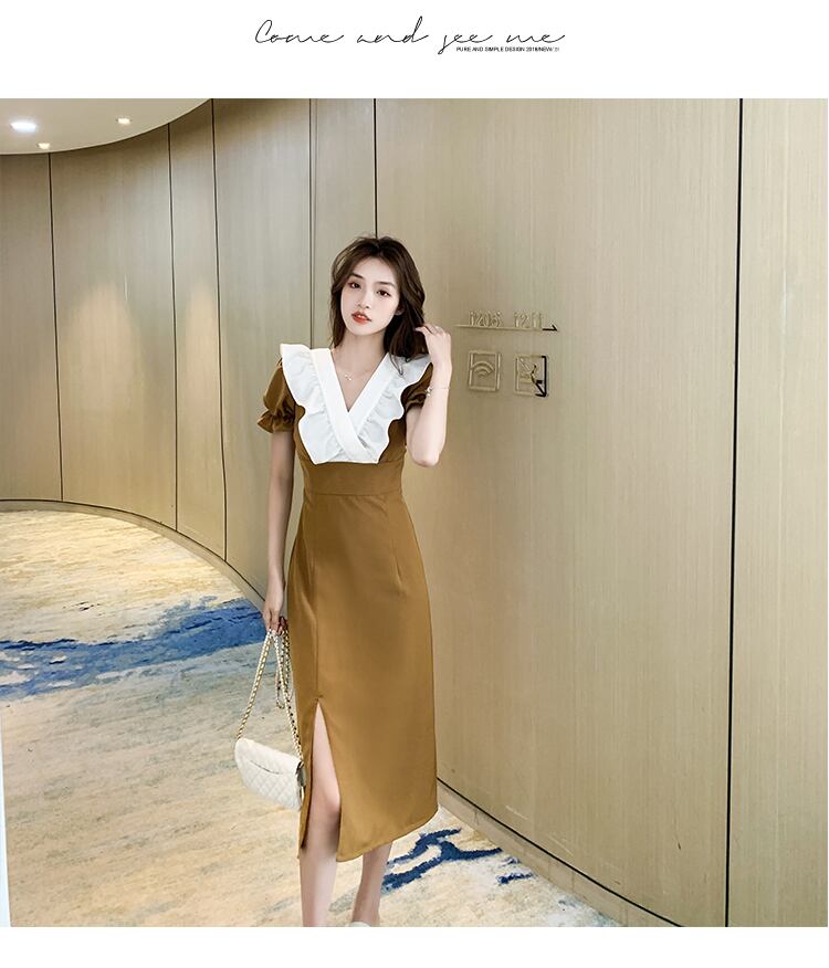 フランスのレトロな優しいスタイルのベルフラワーティーブレイクドレススリムフィットと薄い気質セクシーなVネックスリットドレス女性の夏 サマー 夏物 フラワーデザイン yingd57042797179