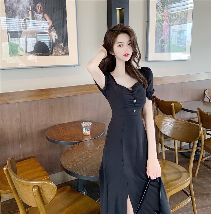 フランスのニッチなスクエアネックパフスリーブドレス女性の夏のウエストは薄い気質人気のヘップバーンスタイルのリトルブラックドレスロングスカートです サマー 夏物 スクウェア yingd6530588589