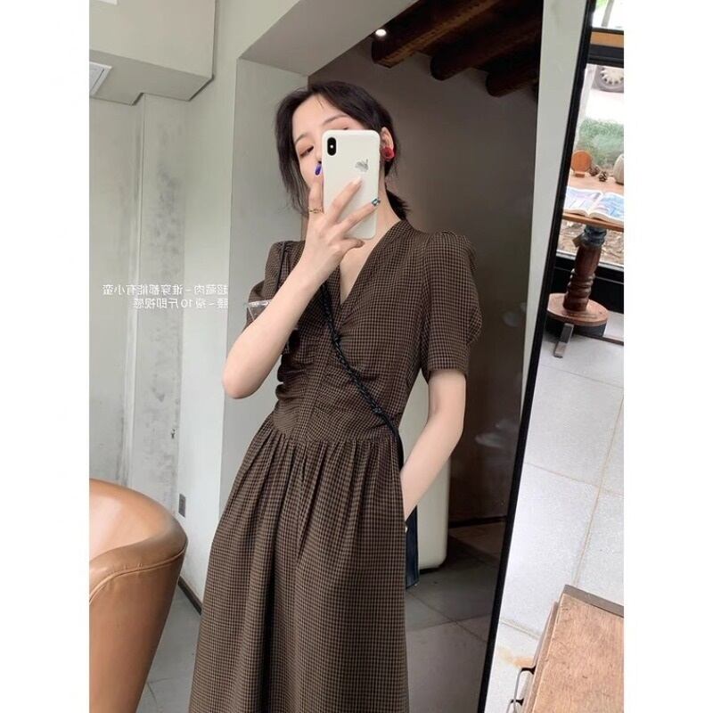 フランスのレトロなロイヤルシスターライトおなじみのスタイルロングスカート女性のスリムフィット、スリムでユニークなデザインセンスVネックチェック柄ドレス女性の夏 サマー 夏物 yingd39503567904