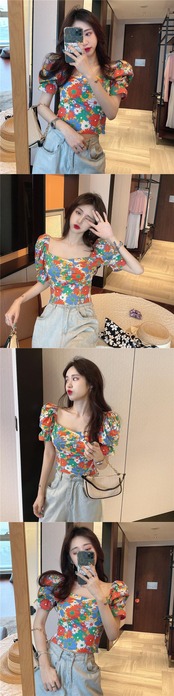 フランスのレトロなフローラルパフスリーブドレス女性2020新しい夏の気質ウエストと薄いスクエアカラーのスカートの女性 サマー 夏物 花柄 スクウェア yingd69247465833
