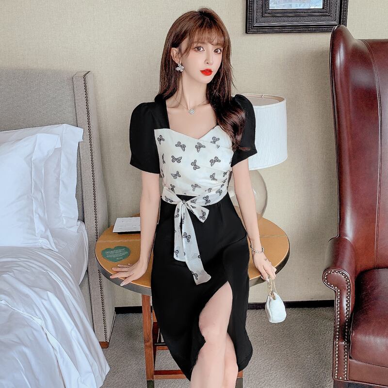 フランスのレトロなヘップバーンスタイルのリトルブラックドレスウエスト痩身気質軽いおなじみのスタイルバタフライプリントステッチドレス女性の夏 サマー 夏物 yingd67627062069