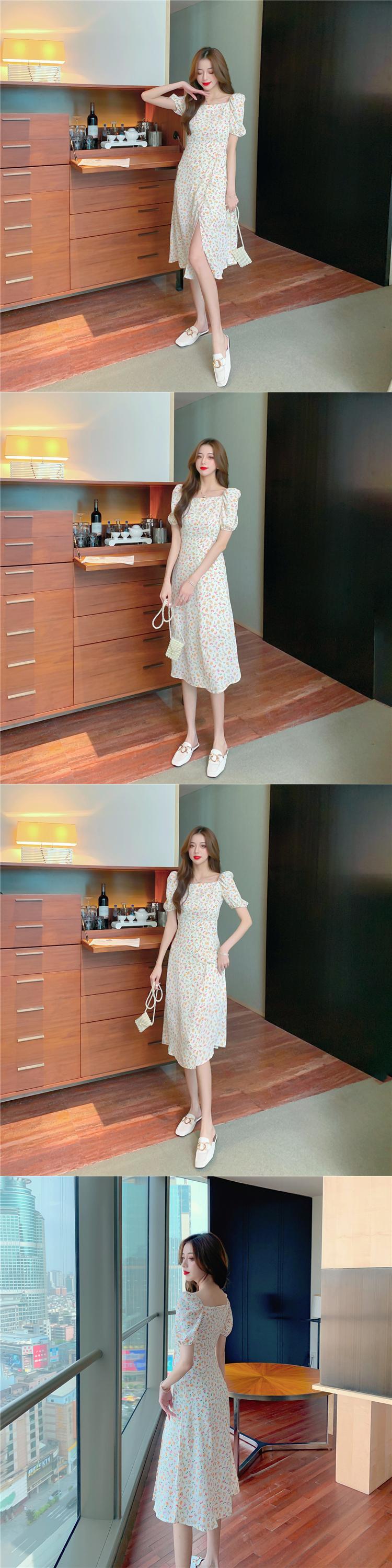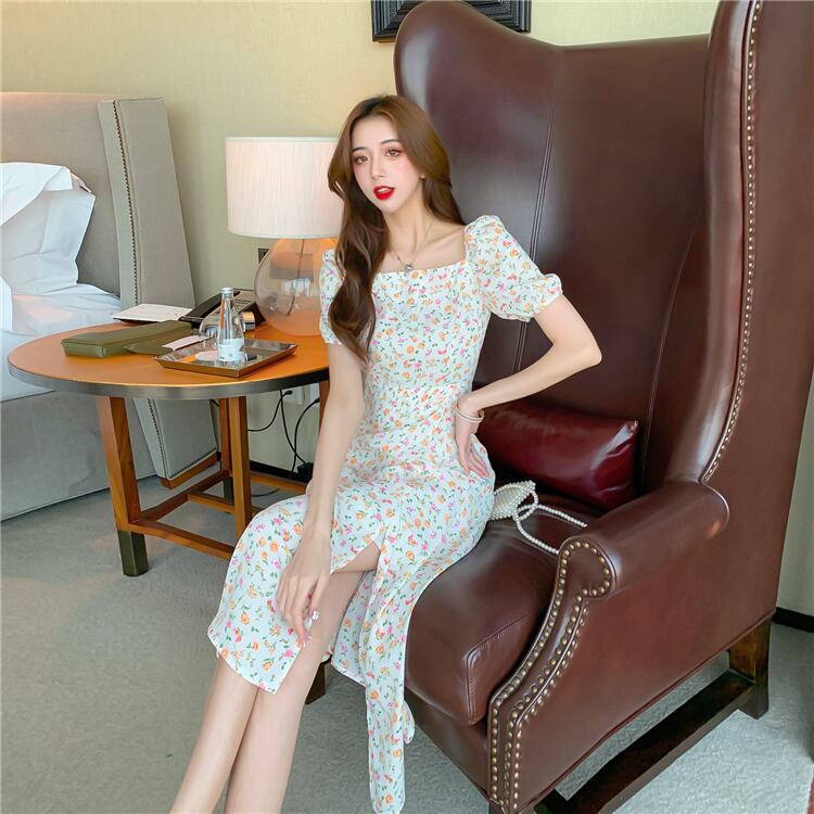 フランスの甘い初恋ドレスレトロ優しい風ウエスト気質スクエアネックパフスリーブシフォン花柄ドレス女性の夏 大人ガーリー スウィート キュート カジュアル サマー 夏物 スクウェア yingd8314696002