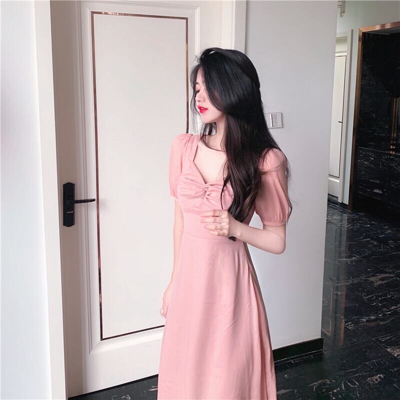 フレンチレトロティーブレイクドレス女性冷風ハイエンド気質ライトラグジュアリーレディースバブルスリーブスクエアカラードレス女性夏 サマー 夏物 スクウェア yingd13472897354