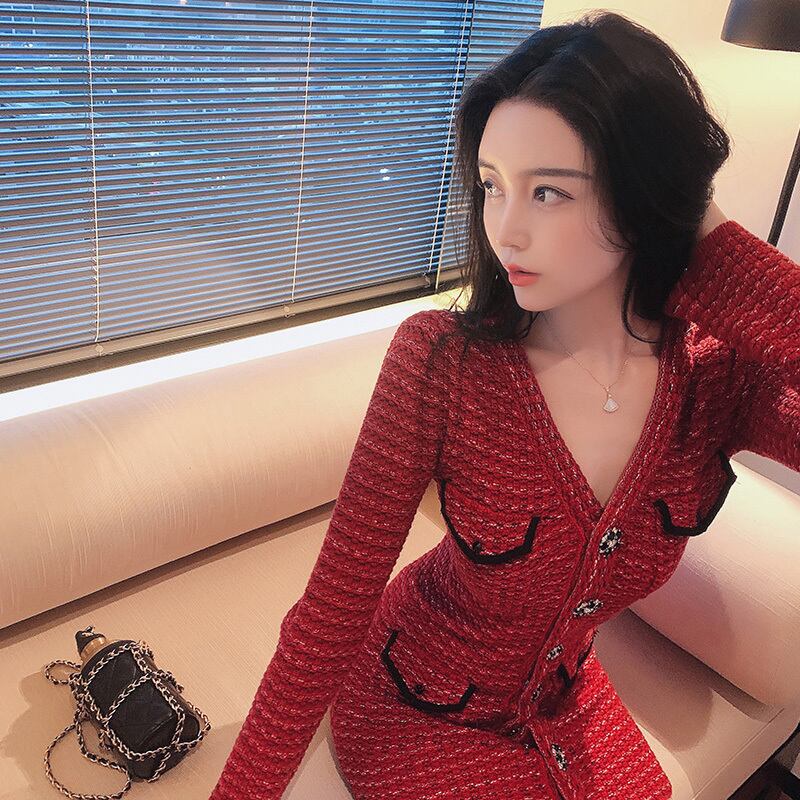 フランスのレトロなヘップバーンスタイルのウエストと薄い気質の軽い豪華な女性年服赤いドレス女性の秋と冬 レッド オータム 秋物 ウィンター 冬物 yingd87533912915