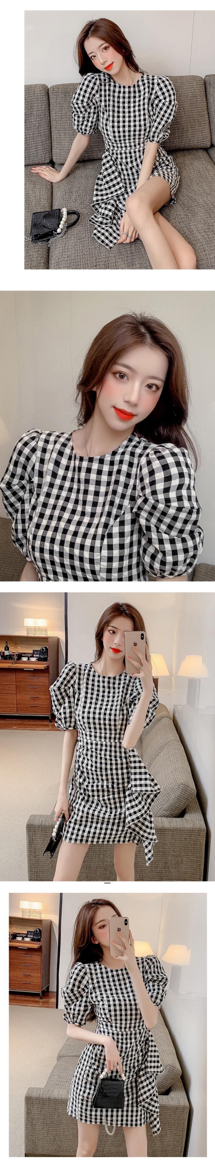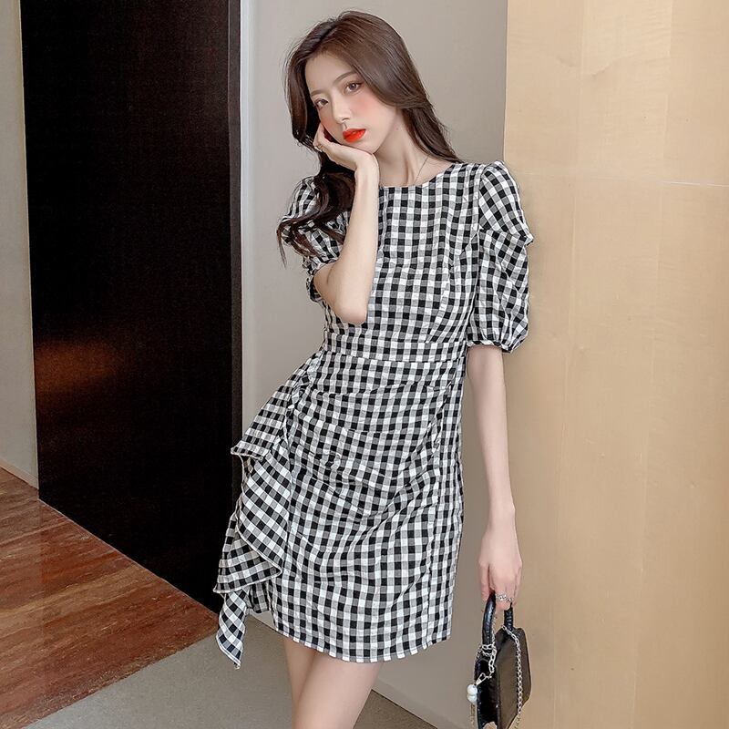 サマードレス2021新しいフレンチレトロシックなデザインセンスニッチウエストパフスリーブプリーツチェック柄ドレス女性 夏物 yingd52177445942