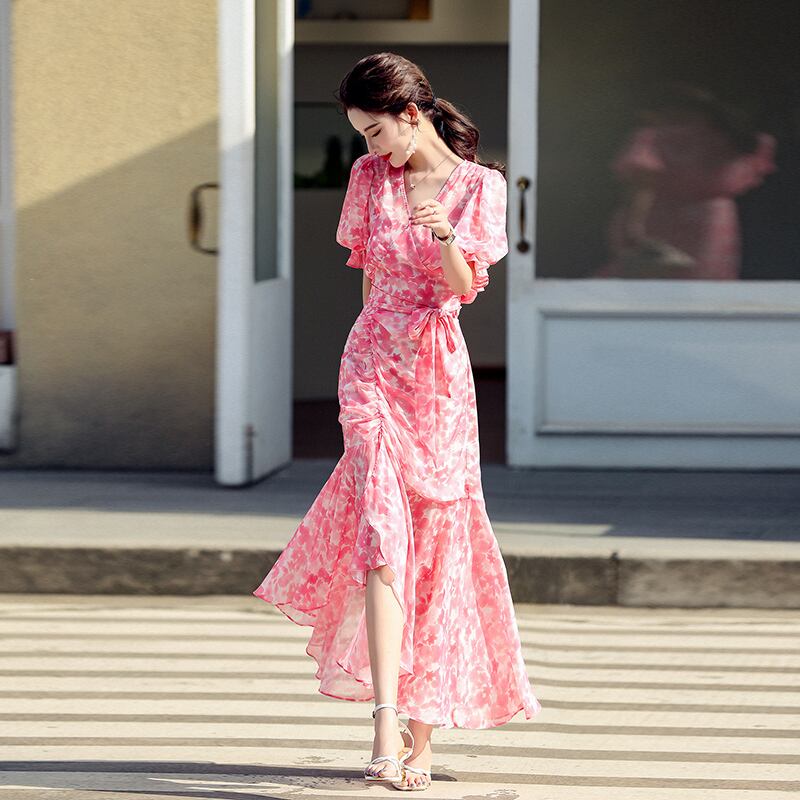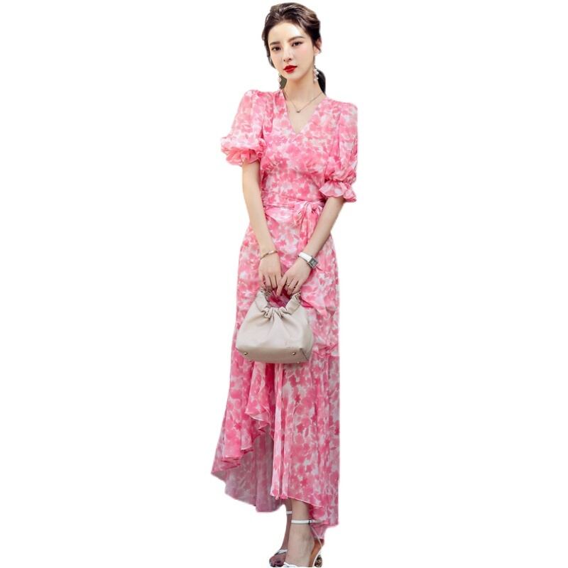 フランスのレトロなロイヤルシスターライトおなじみのスタイルのスーツスカート女性のフランスのレトロなVネックパフスリーブ花柄ドレスツーピース yingd66120010248