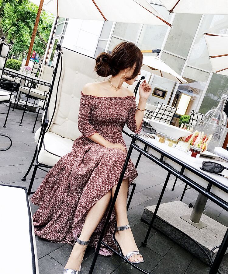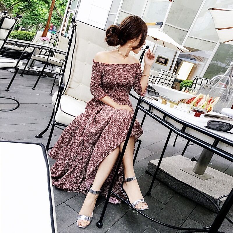 2021年春夏新作レディースフレンチレトロセクシーワンワードネックオフショルダーシフォンフローラルドレスレディースロングスカート スプリング 春物 サマー 夏物 花柄 yingd70674841086