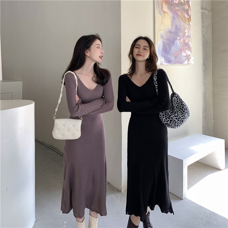 コートとロングスカートで、ウエストは細く、Vネックのセータースカート、長袖のボトミングニットワンピース、女性の秋冬 オータム 秋物 ウィンター 冬物 yingd2770447566