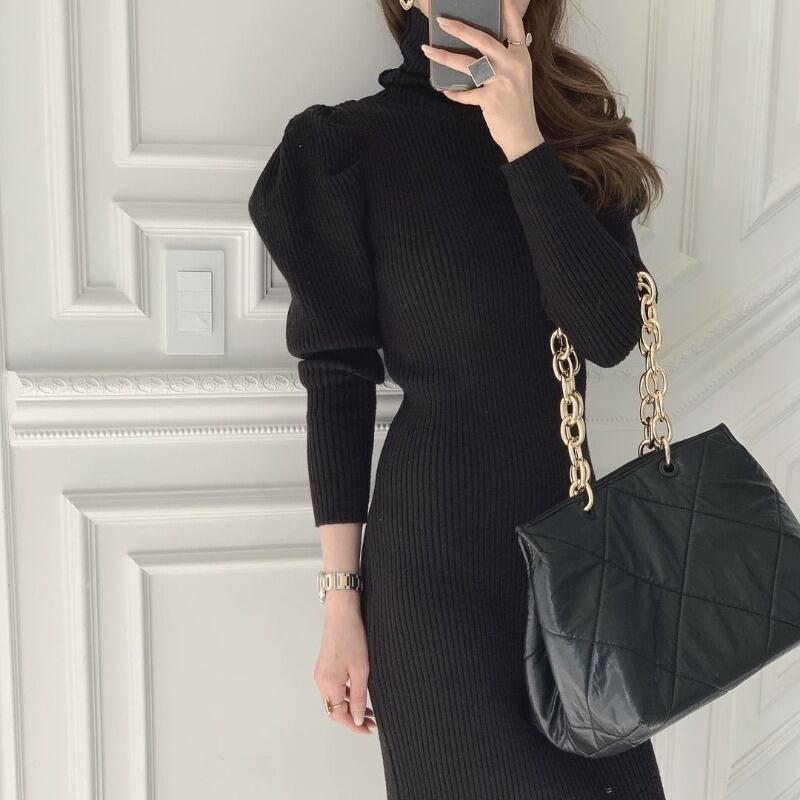 コート、ウィンタースカート、ロングスカート、スリムで上質なロングセータースカート、ニーハイカラー、パフスリーブニットワンピース 冬物 yingd45385343709