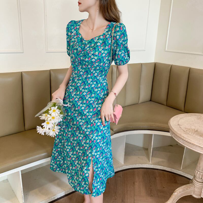 フランスのレトロな優しいスタイルのティーブレイクベルフラワースカートデザインセンスニッチウエストスリムスクエアネックフローラルドレス女性の夏 サマー 夏物 花柄 フラワーデザイン スクウェア yingd47694840112