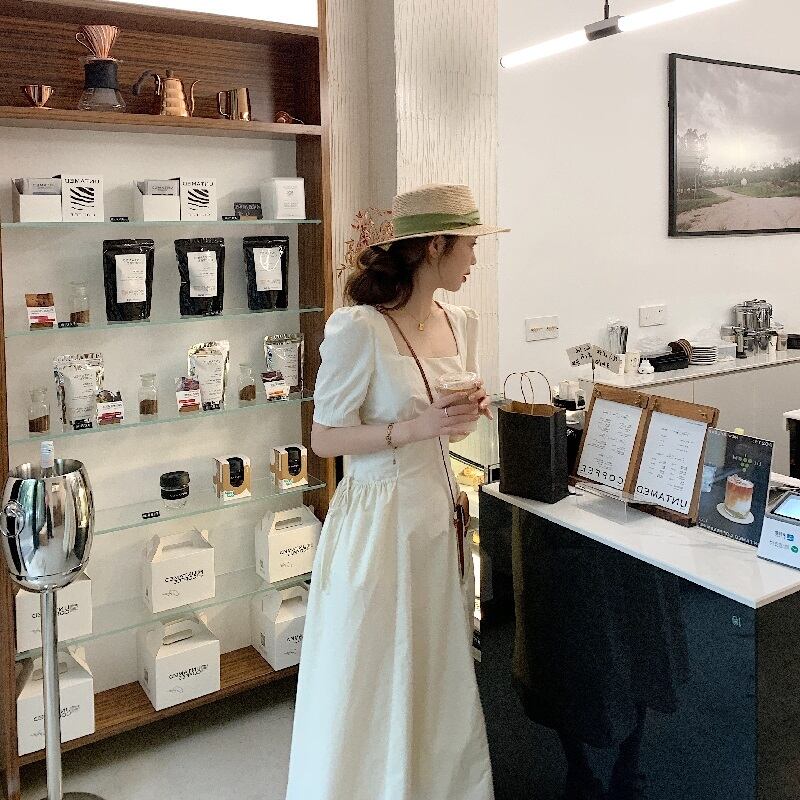 フランスのレトロな優しいスタイルのティーブレイクベルフラワースカートウエストと薄い気質のデザインセンススクエアカラー鎖骨ドレス女性の夏 サマー 夏物 フラワーデザイン スクウェア yingd97524870066