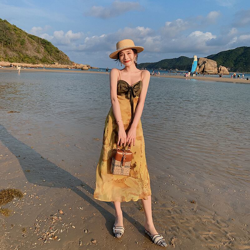 フレンチレトロジェントルティーブレイクベルフラワースカートセクシースリングドレスサマーウエストプリントスリングドレス 夏物 フラワーデザイン yingd58309727722