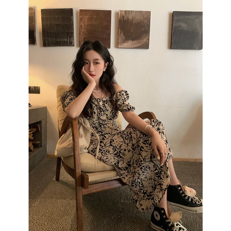 -お茶の休憩を終え、初恋の妖精のスカート、超妖精のエスト、ウエストと薄くてセクシーなワンショルダーの花柄のドレスの女性 yingd80797772111