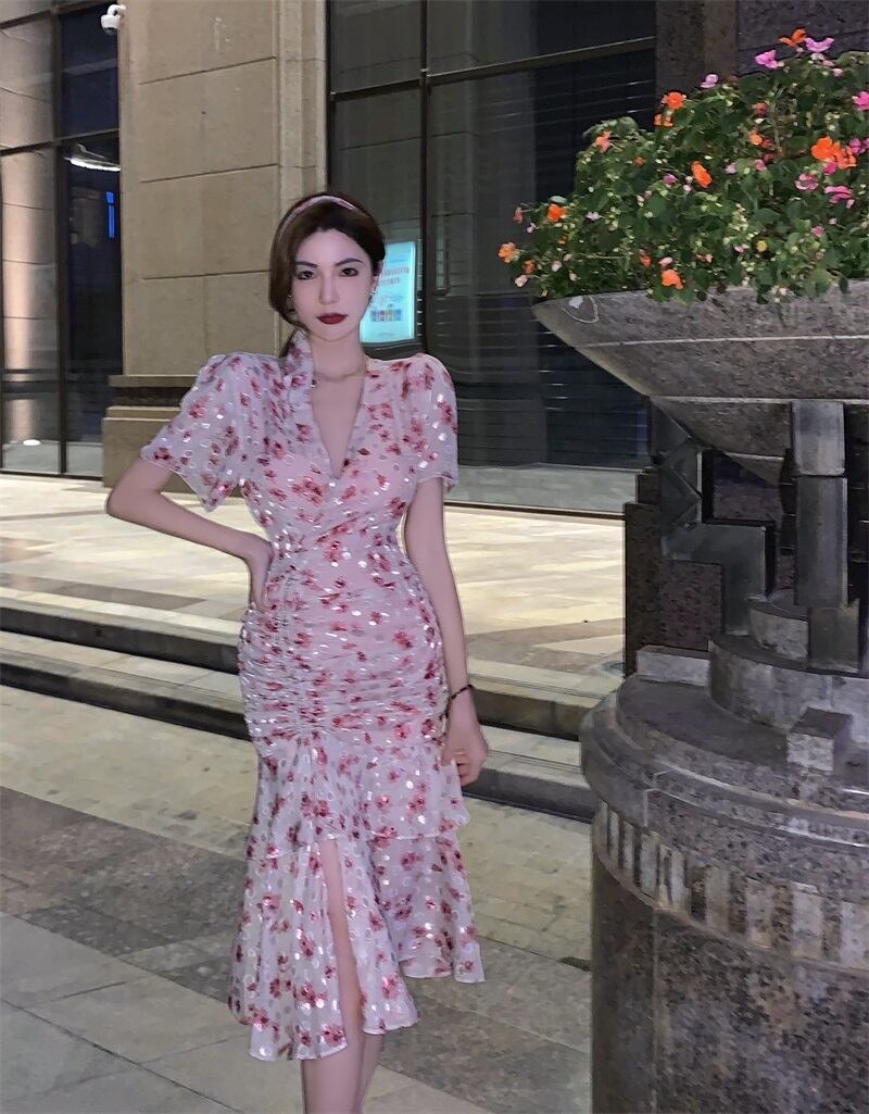 優しいスタイルのティーブレイクベルフラワースカートスリムフィットと薄い気質軽い成熟したスタイルVネックフィッシュテールシフォンフローラルドレス女性の夏 サマー 夏物 花柄 フラワーデザイン yingd80172790170