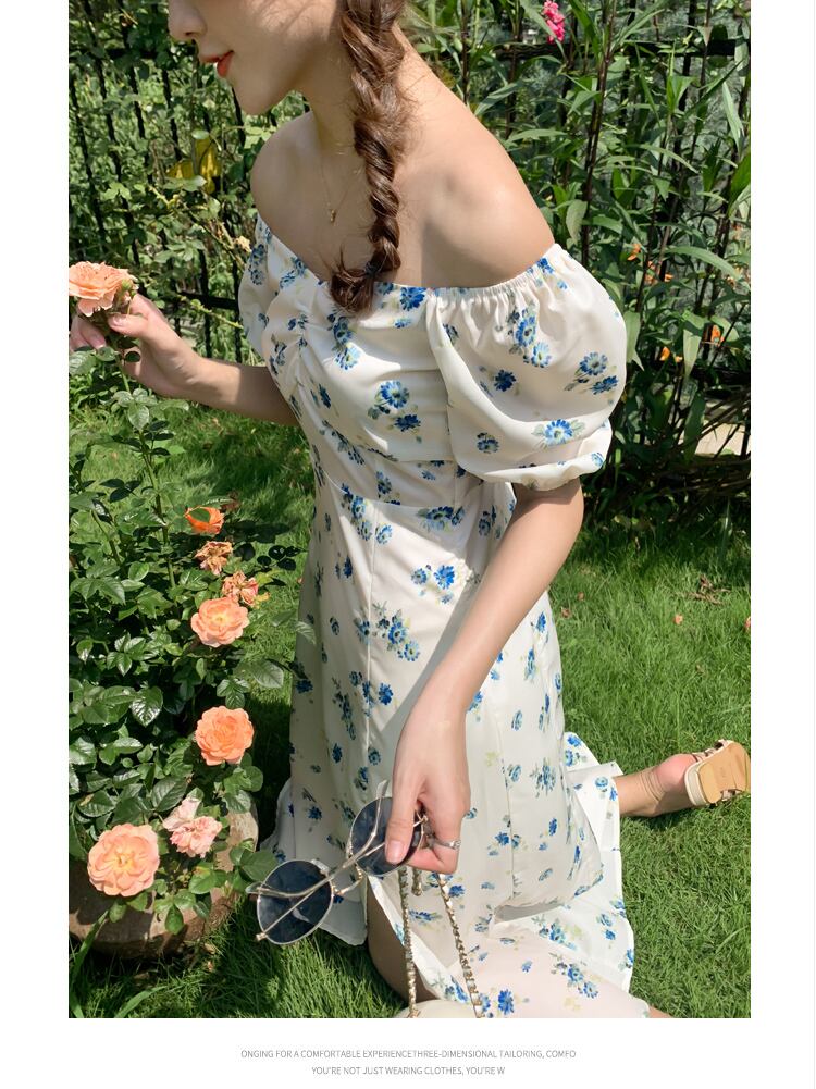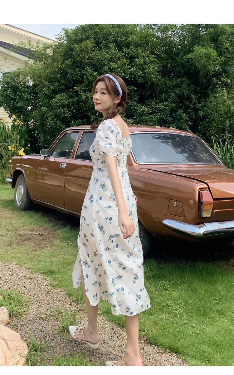 フランスのレトロなパフスリーブ花柄スカートウエストスリム気質優しい風白セクシーなスプリットドレス女性の夏 ホワイト サマー 夏物 yingd93849316494