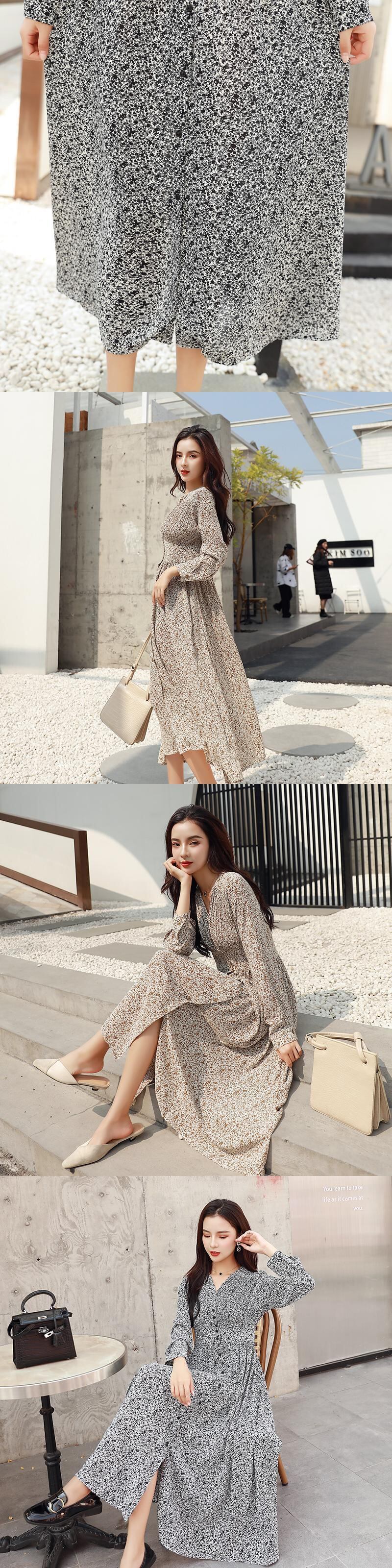 フレンチニッチ優しい風ウエストスリム気質セクシーなVネック長袖シフォンフローラルドレスレディースロングスカート 花柄 yingd77511416581