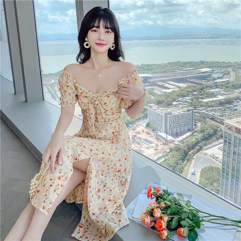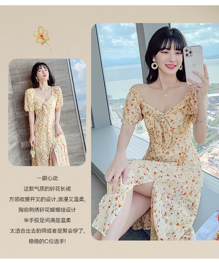 フランスのレトロなベルフラワー初恋スカート優しいスタイルデザインセンススクエアネックパフスリーブシフォン花柄ドレス女性の夏 サマー 夏物 フラワーデザイン スクウェア yingd83100339533