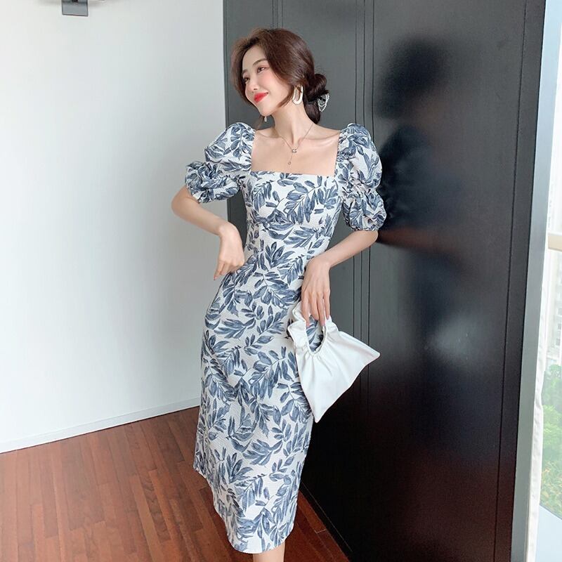 フランスのレトロなヘップバーンスタイルの花柄ドレス夏の新しいウエストライトおなじみのスタイルスクエアカラーパフスリーブ花柄ドレス女性 サマー 夏物 スクウェア yingd1368655357