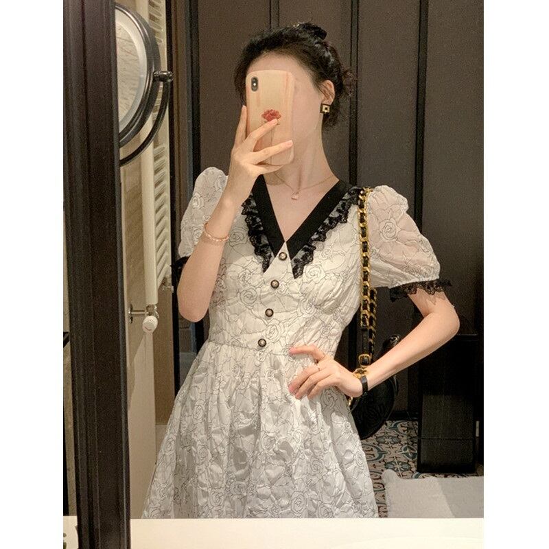 フレンチレトロヘップバーンスタイルライトラグジュアリーレディースローズドレスウエストスリム気質Vネックフローラルドレス女性夏 サマー 夏物 花柄 yingd61007254178