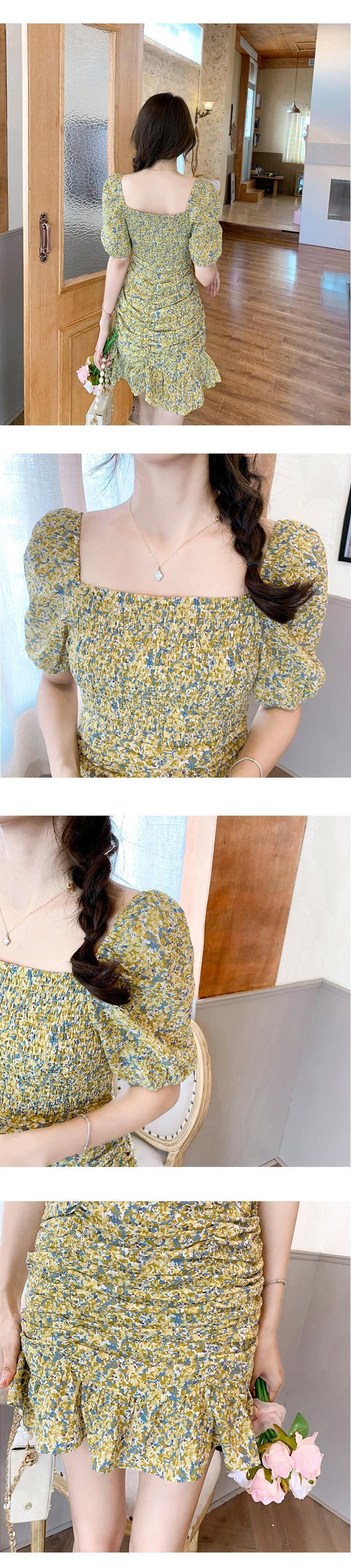 フランスの優しいスタイルのティーブレイクフリルフローラルショートスカート、ウエストと薄い気質のスクエアカラーフローラルドレス女性の夏 サマー 夏物 花柄 スクウェア yingd94930467958